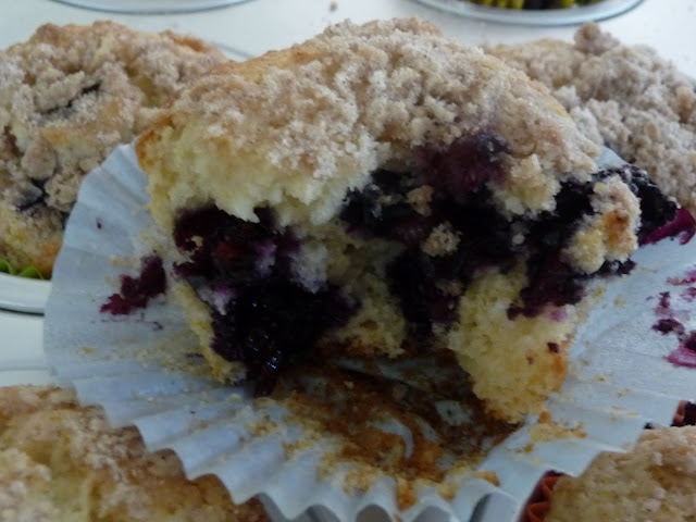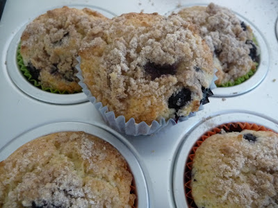 It's blueberry season in New England and the fresh juicy berries are just begging to be made into muffins. I have made many a blueberry muffin in my day, but I was looking for a recipe so simple that my daughters could make them in their sleep! I didn't want to have to cream the butter and sugar, so I started looking for a easy "quick bread" method, where the wet ingredients are just stirred into the dry.