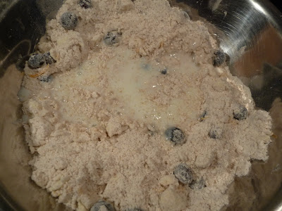 - Toss in the blueberries. Whisk the egg into the buttermilk and add to the mixture.