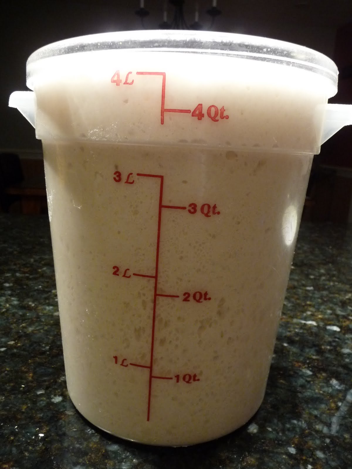 - Place lid on the container or cover the bowl and leave to rest on counter for 2 hours. The dough will rise nearly 3 times in size.